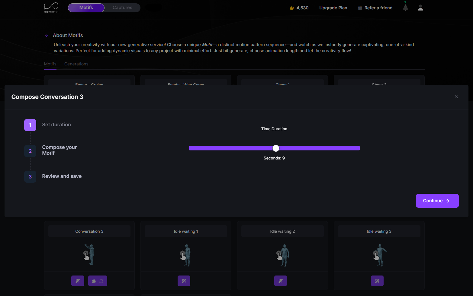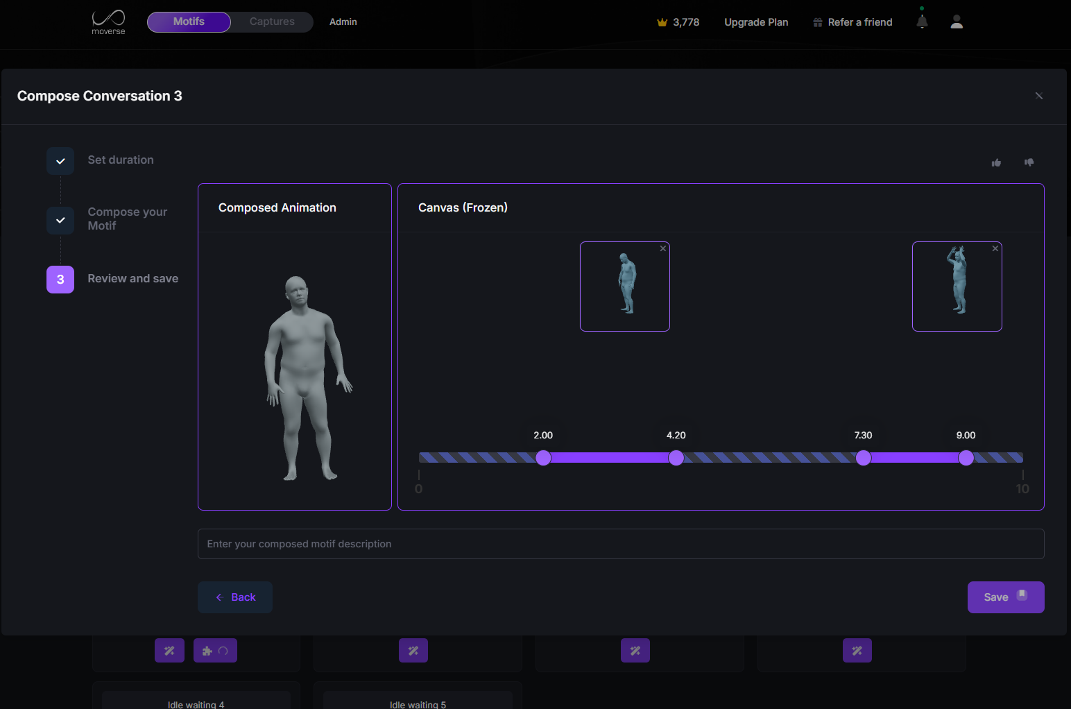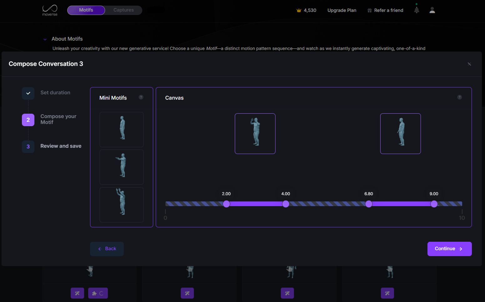 - Timeline: Drag and drop mini Motifs on the timeline. Any unused space will be filled by the AI, leading to a smooth and plausible generated animation.